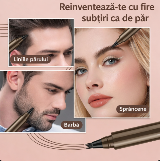 Vârful cu patru dinți imită firele de păr pentru linii fine instant. Obții sprâncene uniforme și naturale în câteva secunde, ideale pentru dimineți grăbite sau retușuri la birou.